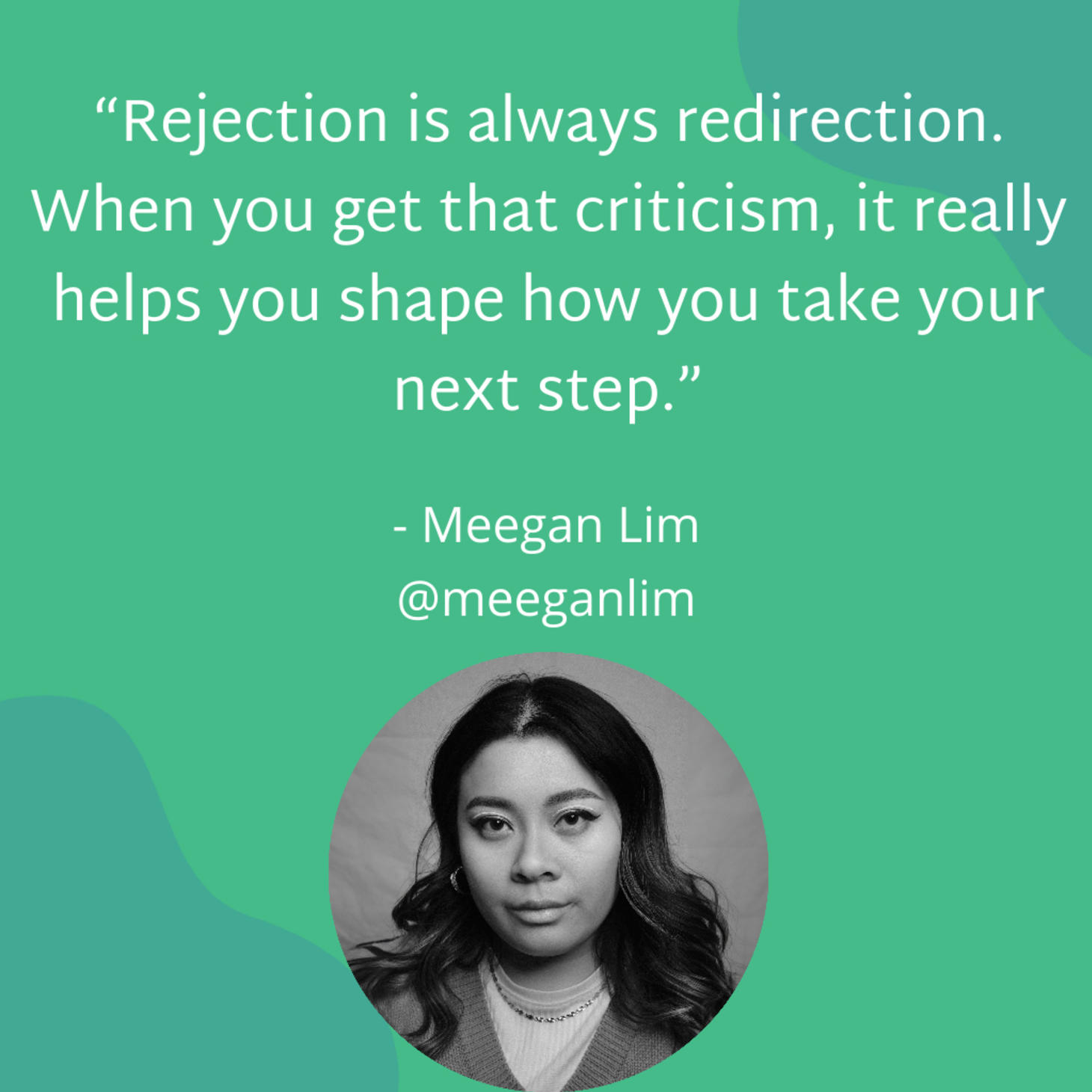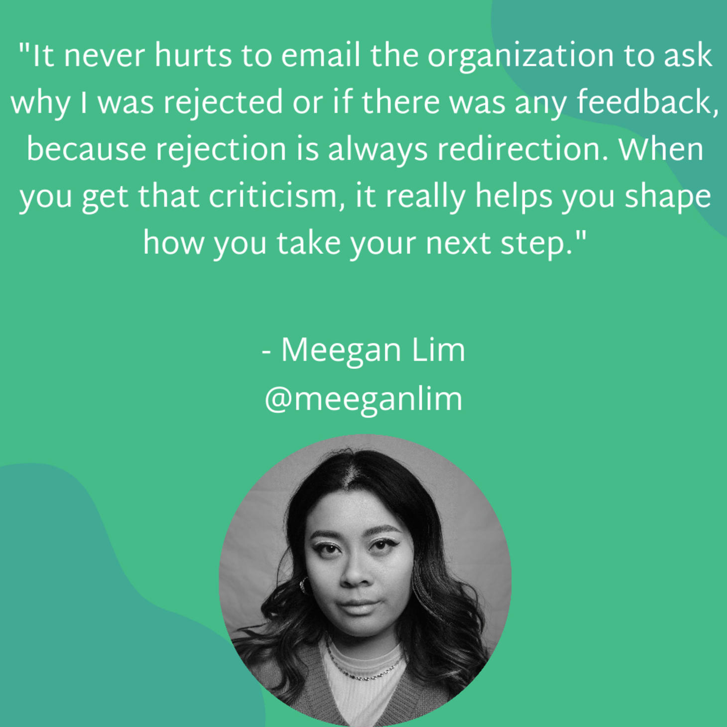 "I still allow myself to feel a little bummed after every rejection, especially if it's something that means a lot to me. But I try not to let it stop me from applying. It never hurts to email the organization to ask why I was rejected or if there was any feedback, because rejection is always redirection. When you get that criticism, it really helps you shape how you take your next step... It's honestly about just moving on and not having a huge ego about it."