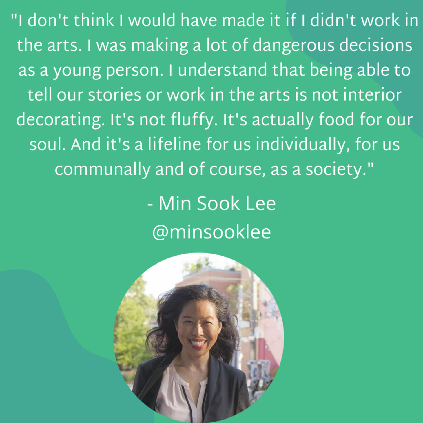 "I don't think I would have made it if I didn't work in the arts. I was making a lot of dangerous decisions as a young person. I understand that being able to tell our stories or work in the arts is not interior decorating. It's not fluffy. It's actually food for our soul. And it's a lifeline for us individually, for us communally and of course, as a society."